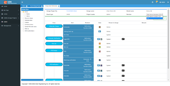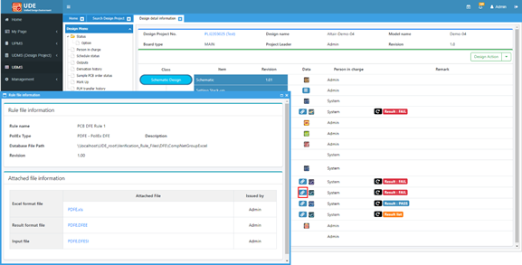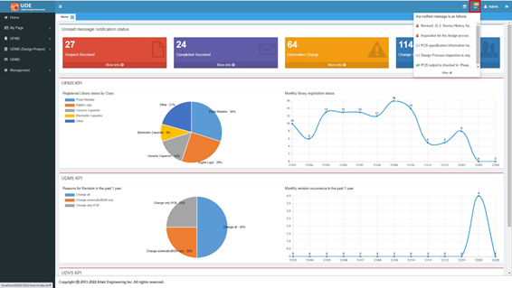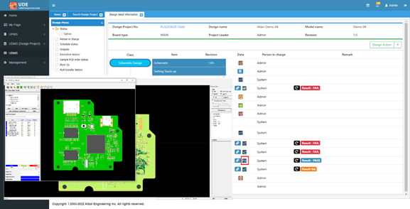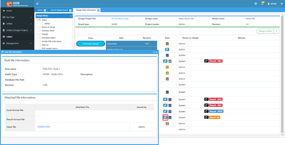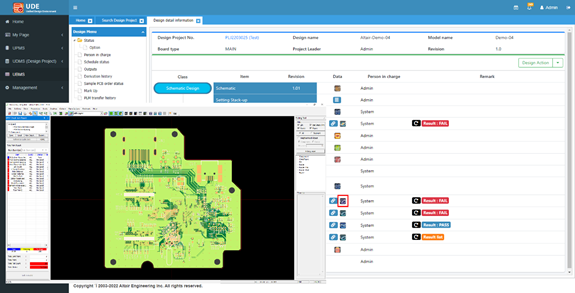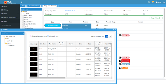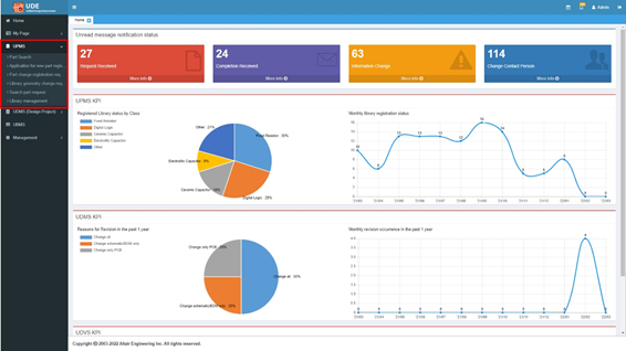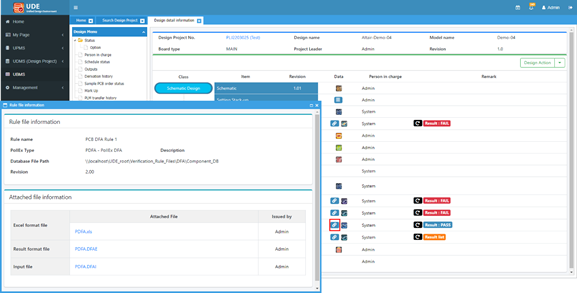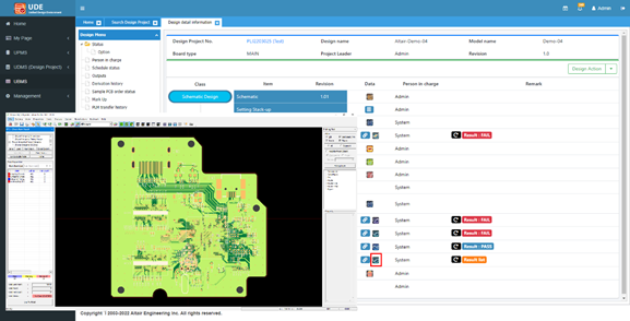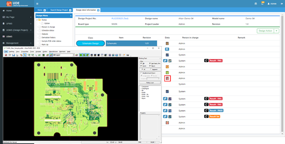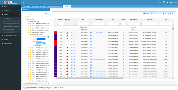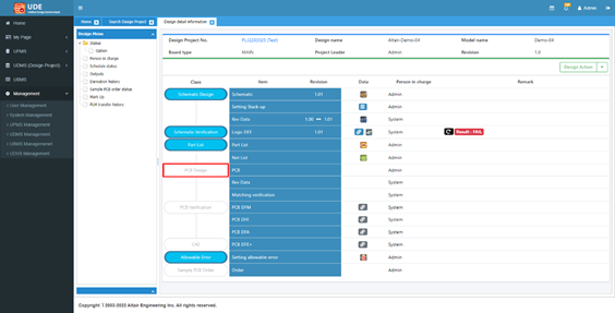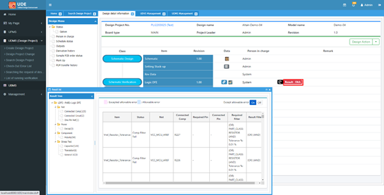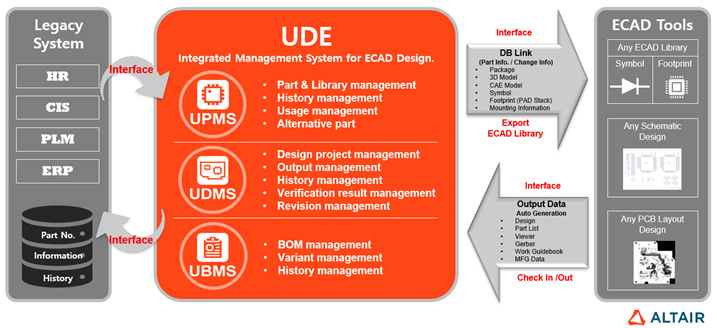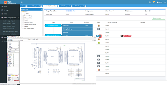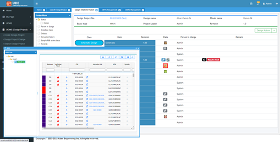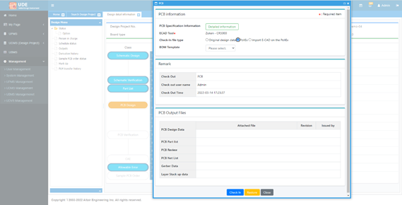 UDMS: Unified management system which manages design data from creation to finish through managing each development process. Automated checking system for suitability of part and consistency between schematic, PCB and BOM.