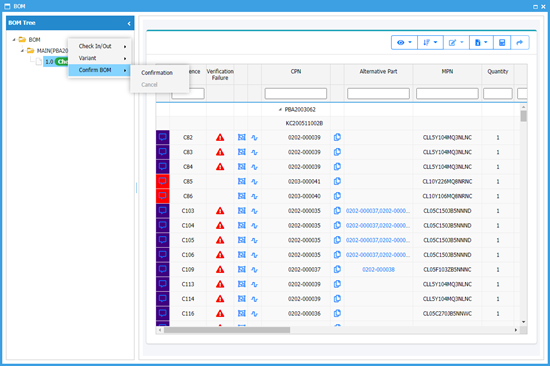 Select Altair-Demo-04 > MAIN > PBA2003065 > 2.0, right-click, and select Confirm BOM > Confirmation.