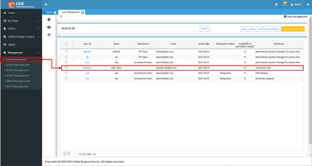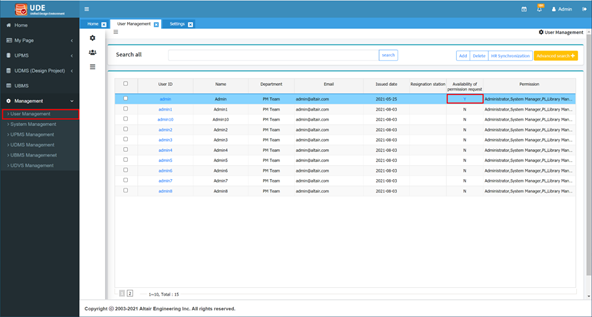 Figure 17.Note: For explanation, assume that the system manager has received an email for requesting permission and explain the process of approving user permissions as follows. - Select Management > User Management.