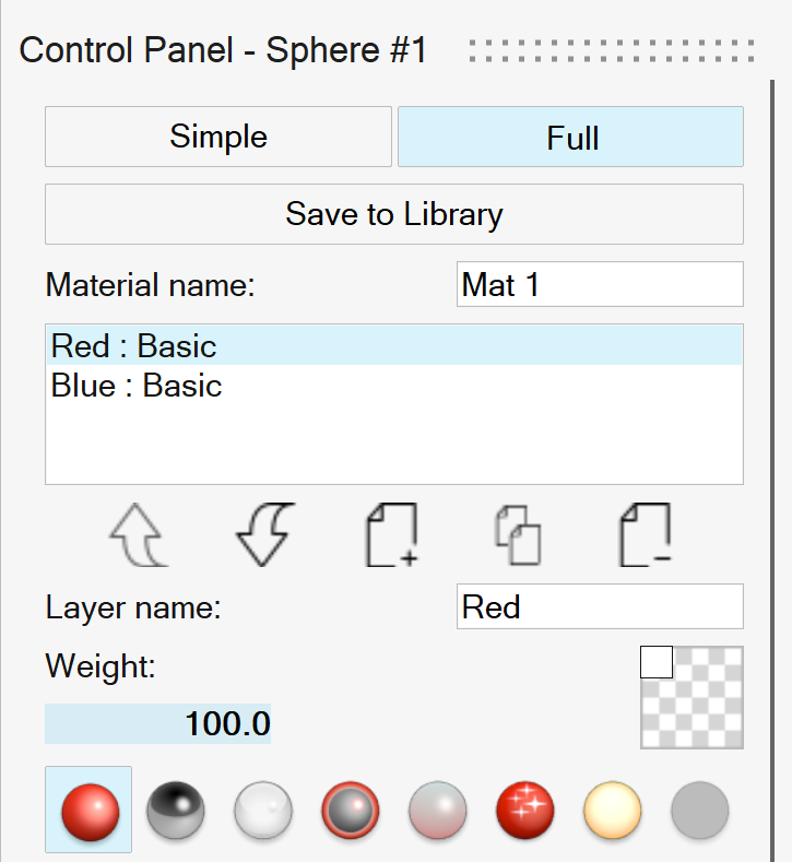 The area below the Material name lists the layers in the selected material. When you select a layer from the list, the corresponding layer type (Basic, Metal, etc.) is highlighted.