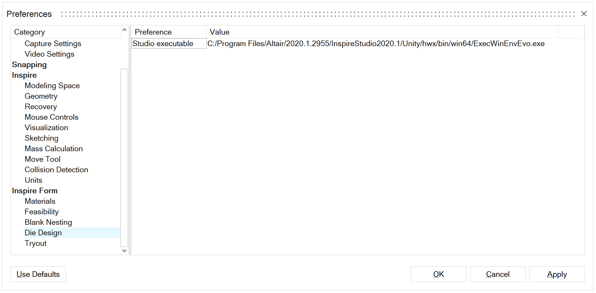 4. In the Preferences, verify that the path to the Studio executable has been set. For example, under Category, go to Inspire Form > Die Design.