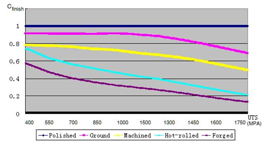 表面仕上げの補正係数Cfinishを使用して、表面の粗さの特性を記述します。研磨、機械加工、鍛造といった質的な見地から仕上げを分類して表記された図から、この係数を読み取ります。 (*出典:Yung-Li Lee, Jwo.Pan, Richard B. Hathaway and Mark E. Barekey.Fatigue testing and analysis: Theory and practice, Elsevier, 2005)