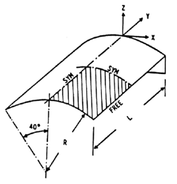 ドームがカーブしたエッジで支持されており(Ux, Uz = 0)、直線エッジでは拘束されていません。対称性があるため、1/4セクションのみが解析されました(図 1)。