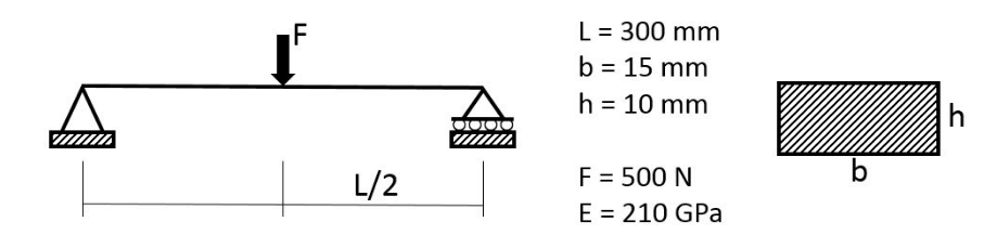 テスト番号VS13中間点に荷重がかかるピン留めされた梁に対する最大変位と応力を求めます。