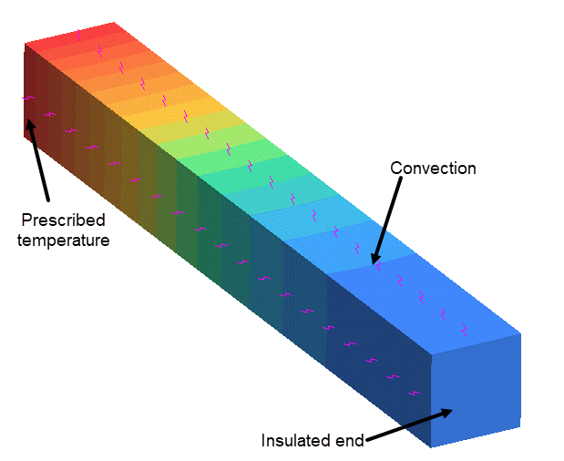 テスト番号VT01流体で囲まれた冷却フィンの一方の端を一定の温度に維持した状態で、もう一方の断熱された端の温度を求めます。
