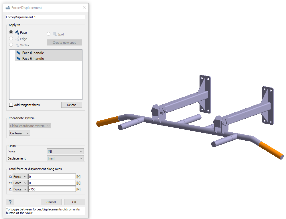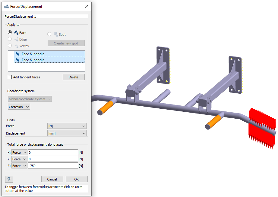 创建力载荷 在分析工作台中,点击 (力/位移)。 图 4. 在对话框中,确保已选中面单选按钮。 在模型视窗中,选择 图 5 中显示为橙色的两个手柄面。 图 5. 将 Z 方向的力指定为 -750 N。 点击确定。新载荷,力/位移1,出现在项目树中。表示载荷的矢量会显示在模型上。