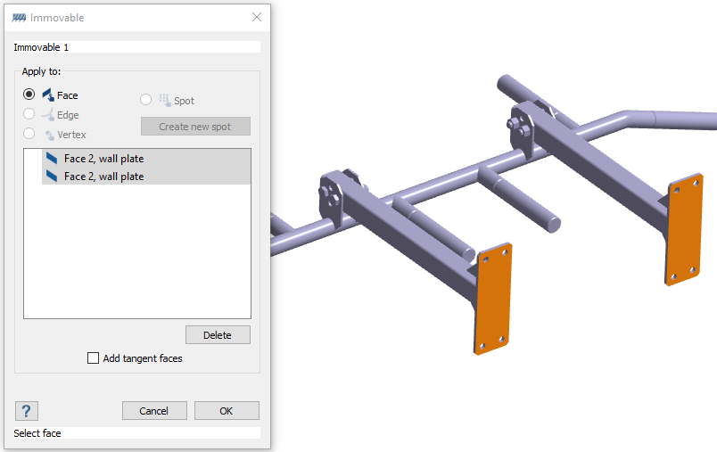 创建固定支座 在分析工作台中,点击固定支座 。 图 2. 在对话框中,确认已选中面单选按钮。 在模型视窗中,选择 图 3 中显示为橙色的两个面。 图 3. 点击确定。新约束,固定 1 会出现在项目树中。约束的可视表示会显示在模型上。