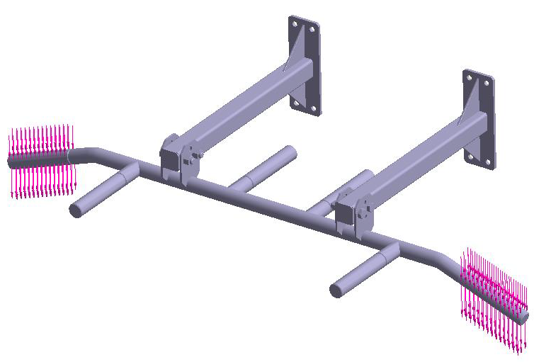 零件 1:创建设计研究 1 导入几何模型 启动新 SimSolid 会话。 点击从文件导入 。 图 1. 在打开几何体文件对话框中,选择 Pullup bar V1.x_t。 点击打开。 装配将加载到模型视窗中。将弹出信息窗口,警告检测到重叠零件。还将打开查看重叠零件对话框。 关闭信息对话框,然后关闭查看重叠零件窗口。 创建连接 在项目树中,点击连接分支。 在连接工作台工具栏,点击 (自动连接)。 将间隙和穿透容差指定为1。 将连接分辨率级别设置为增强。 点击确定。 注: SimSolid 即使在几何体重叠的区域也会创建连接。 SimSolid 会自动识别螺栓、螺母和垫圈。 滑动接触会自动施加于螺栓杆,否则会施加绑定接触。 分配材料 在项目树中,点击装配分支。 在工作台中,点击 (施加材料)。 从通用材料列表中选择钢。 点击施加于所有零件。 点击关闭。在项目树的装配分支中,将识别每个零件的材料属性。 创建结构线性分析 在主窗口工具栏上,点击结构分析 > 结构线性。新分析会显示在项目树中的设计研究 1 下,分析工作台会打开。 创建固定支座 在分析工作台中,点击固定支座 。 图 2. 在对话框中,确认已选中面单选按钮。 在模型视窗中,选择 图 3 中显示为橙色的两个面。 图 3. 点击确定。新约束,固定 1 会出现在项目树中。约束的可视表示会显示在模型上。 创建力载荷 在分析工作台中,点击 (力/位移)。 图 4. 在对话框中,确保已选中面单选按钮。 在模型视窗中,选择 图 5 中显示为橙色的两个手柄面。 图 5. 将 Z 方向的力指定为 -750 N。 点击确定。新载荷,力/位移1,出现在项目树中。表示载荷的矢量会显示在模型上。 创建第二个结构线性分析 在项目树中,右击结构 1。 从右键菜单中选择复制。 结构 2 分析会显示在项目树中。 图 6. 点击结构 2 旁边的 即可扩展分析分支。 编辑手柄载荷。 双击载荷/位移。结构 2 下的 1。 图 7. 在力/位移对话框中,选择当前所列的面并选择删除。 在 模型视窗 中,选择两个前手柄面。 图 8. 点击确定。表示载荷的矢量会显示在模型上。 图 9. 工况 1 图 10. 工况 2 运行设计研究 求解设计研究中的所有分析。 在项目树中,选择设计研究1分支。 点击运行所有分析 . 在求解管理器中,确认已选择所有分析。 点击求解。 SimSolid 会运行设计研究分支中的所有分析。结束后,每个分析的结果分支将显示在项目树中。注: 分析 1 在 11 秒内运行。SimSolid 会重复使用分析 2 的模型数据结构,因此分析会运行得更快。 将结果与书签进行比较 在项目树中,选择分析 1 的结果分支。 在分析工作台上,点击 (结果图)。 选择位移大小图。 在图例窗口中,点击 (显示变形形状)。 模型视窗会更新以显示所选结果并展示选项。 点击 (捕捉书签)图标。 SimSolid 将当前在模型视窗中显示的数据另存为图像或动画,并在书签浏览器中显示缩略图。可以随时选择书签以在模型视窗中显示保存的视图。 图 11. 为分析 2 重复步骤 1 至 5。 使用书签浏览器在不同结果之间切换。