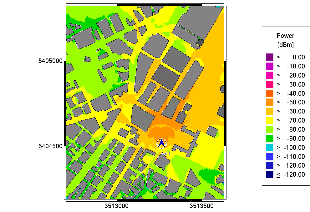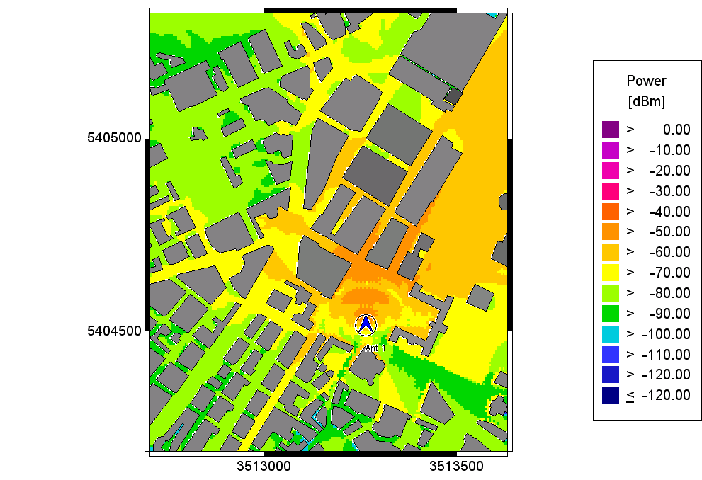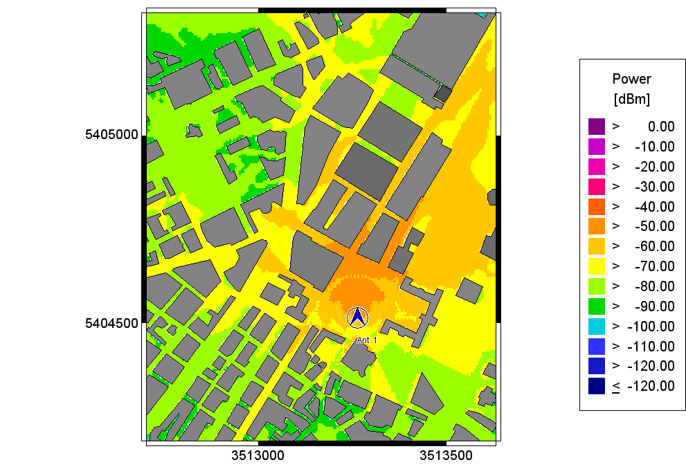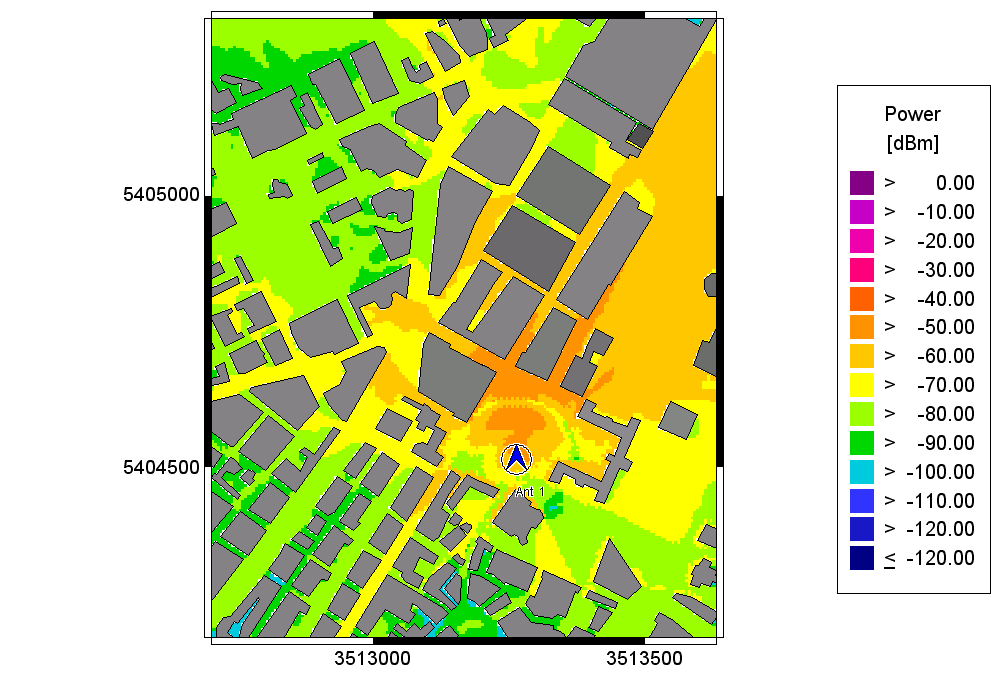 Figure 1. Prediction of received power if using the measured 3D antenna pattern (Tx height 20 m).
