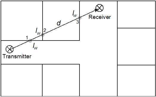 As shown in Figure 1 the parameter kw describes the number of walls intersected by the direct path between transmitter and receiver. A uniform transmission (penetration) loss lw for all walls is used for the computation, that is the material properties of the individual walls are not considered. This uniform transmission loss can be specified by using the Settings button.