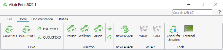 The Launcher utility is a single application that allows you quick access to the shortcuts for the Feko components, WinProp components, newFASANT, WRAP components, documentation, Altair license utility and updating parallel credentials. Pin the application to the taskbar for quick launching.