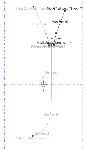 Track startpoints and endpoints are denoted “portals”. A track is a tunnel which does not need to have a constant cross-section. Cross-sections are defined in separate windows in TuMan and are assigned to segments of the tracks. This example has two cross-sections, denoted “tube tunnel” and “tube station”. The tube station is wide enough to connect to two tube tunnels.