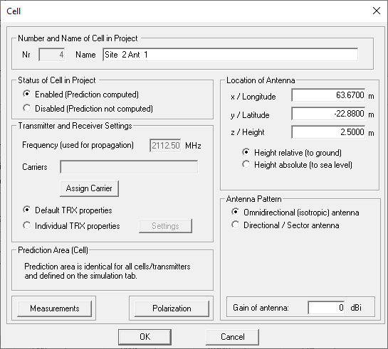 Define the second site, place the second omnidirectional antenna at this location, and assign a carrier. The antenna is placed at a height of 2.5 m above ground.