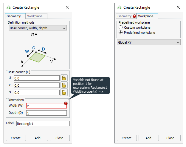 Figure 1. The soft message bubble indicating that an undefined variable was used on the Geometry tab of the Create Rectangle dialog.