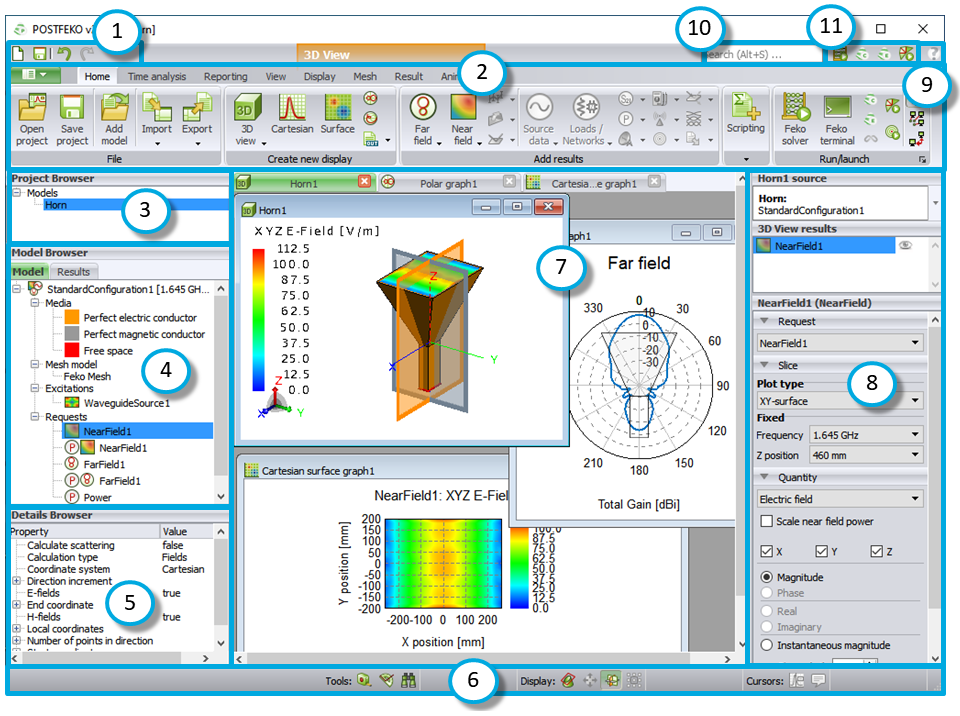 View the main elements and terminology in the POSTFEKO graphical user interface (GUI).