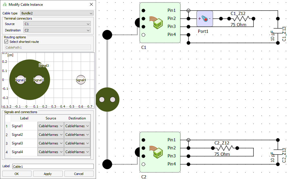 Figure 2. Cable harness and schematic view with cable reference direction set.