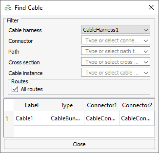 Figure 1. The Find Cable dialog. - Under Filter, from the Cable Harness drop-down list, select the cable harness you want to find.