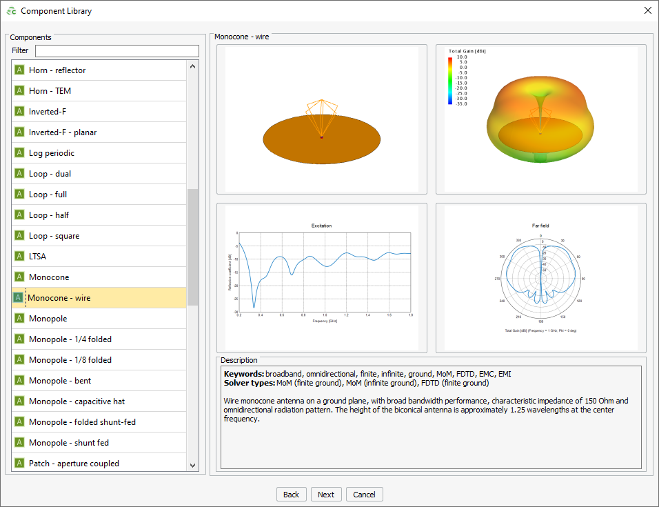 The component library tool is also a great way for students to learn about the different types of antennas and its typical characteristics.