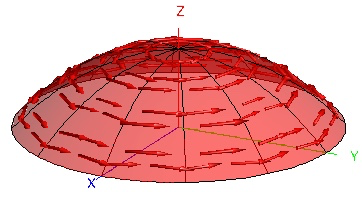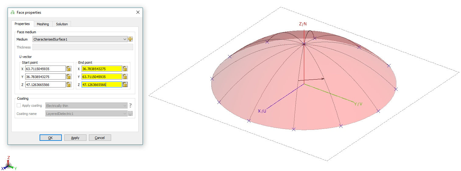Curved surfaces such as radomes have to be split into smaller faces so that a valid U-Vector can be defined for each surface. As an illustration, consider a sphere. There is no single vector that has a valid projection onto the surface of a sphere, since at two points, the vector points in the direction of the face normal.