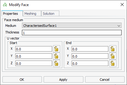 When a characterised surface definition is applied to a face, you must specify a vector to ensure the correct surface orientation. The U-Vector should be set to point into the direction of the U-Vector (or X vector in global coordinates) of the original characterised surface. This characterisation is performed either through solving with periodic boundary conditions, an infinite ground plane or measurements. The projection of the U-Vector onto the face correspond to the U-Vector (or principal direction) of the original characterised surface.
