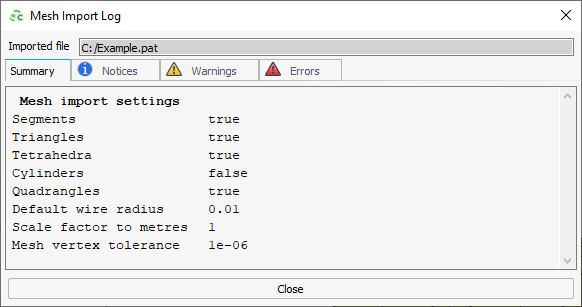 View the log file for a summary of the last mesh import. This information is useful in cases where the import conversion fails.