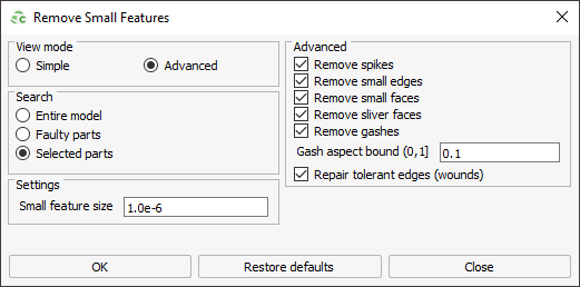 The Remove small features tool attempts to remove small features, such as edges, faces, spikes and gashes.