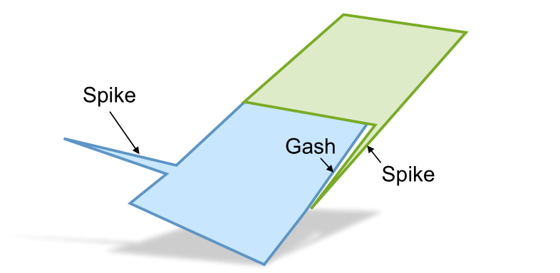 - Gashes are similar to spikes. They also have a high aspect ratio and small area. Gashes are always located between at least two faces. If this option is selected, gashes are removed. The Small feature size for gashes is the maximum width of any gash to be removed.