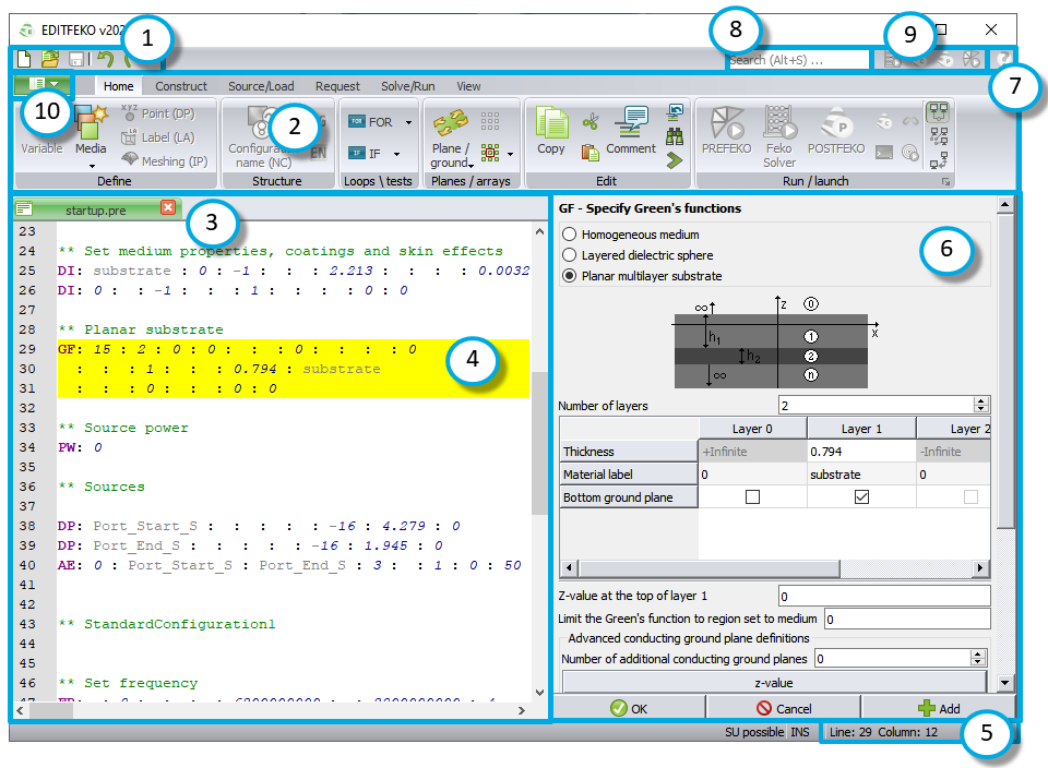Quick Tour of the EDITFEKO Interface View the main elements and terminology in the EDITFEKO graphical user interface (GUI). Figure 1. The EDITFEKO window. Quick Access Toolbar Ribbon Script Editor Area Edit Card Status Bar Card Panel Help Search Bar Application Launcher Application Menu