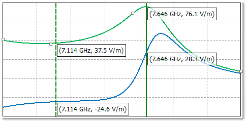 Cursors are dynamic and allow you to interact and move the cursors. Drag the cursors until they are placed at the desired positions. Cursors allow data to be read off several traces simultaneously but suffer from the limitation that it cannot update along with the results.