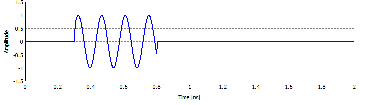 Figure 3. The Signal preview shows the sine wave pulse with a delay of 0.3 ns and a duration of 0.5 ns. - Add a delay of 0.3 ns to the sine wave by extending Equation 3