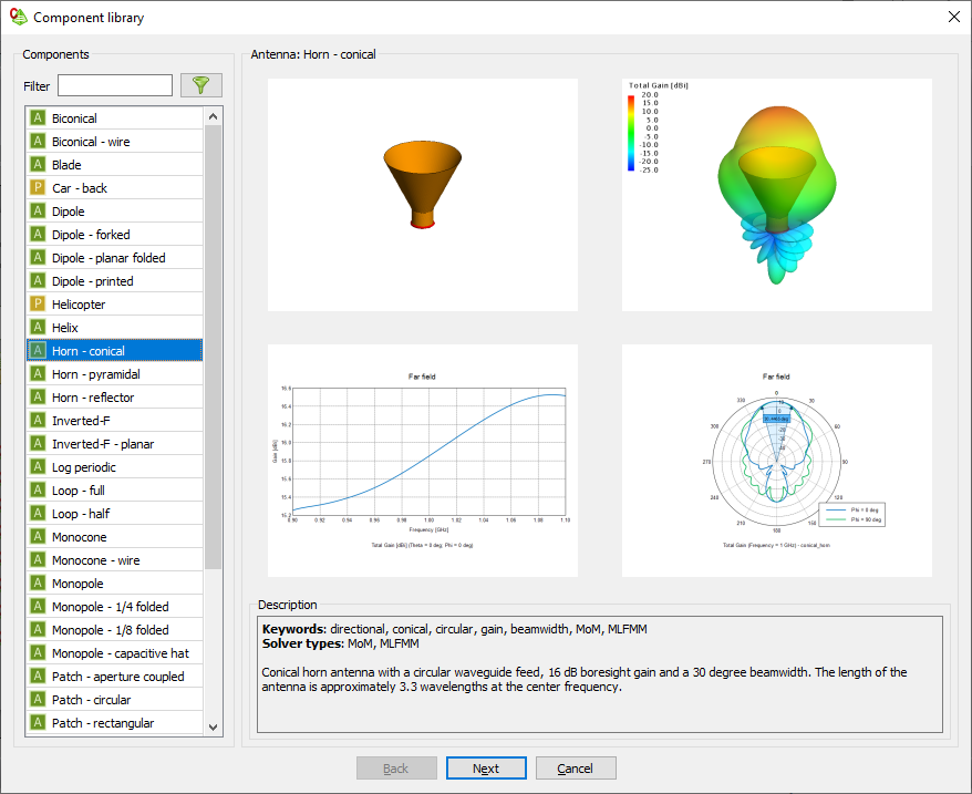 - Introduced a component library that contains a collection of antenna models and platform geometry. The component library can be used to add a component to a new or existing model. When browsing through the components, preview images of the geometry and antenna characteristics are displayed. For antenna models, the centre frequency, solver method and other settings can be changed to facilitate model setup.