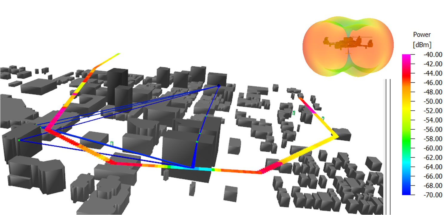 Figure 2. An illustration of a virtual flight test as an example of a 3D trajectory in an urban scenario. - Added support for predictions on a trajectory with varying heights to the dominant path model in all scenarios (indoor, urban and rural).