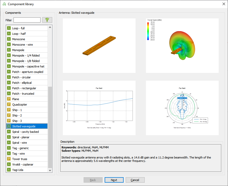 - Added 10 new antennas to the component library, including spirals, RFID tags, an elliptical patch, a TEM horn, a crossed dipole and a slotted waveguide antenna.