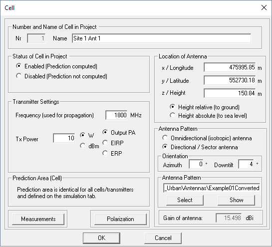 Figure 4. The Cell dialog for antenna 1. - Repeat Step 6 to Step 12 to define antenna 2.