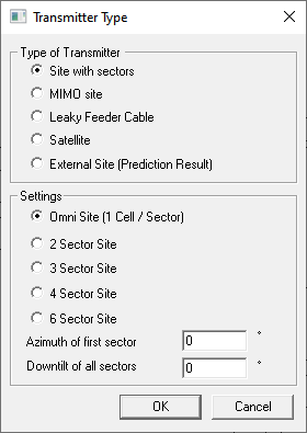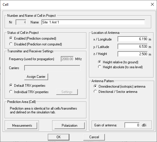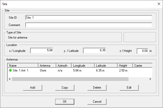 Define the first site, place the first omnidirectional antenna at this location, and assign a carrier. The antenna is placed at a height of 2.5 m above ground.