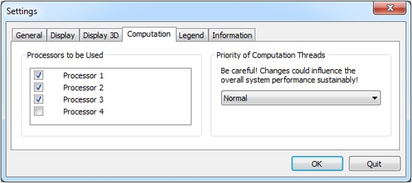 - Check processors that can be used by the computation engine to compute the selected computation task. If multiple processors are enabled the engine will compute multiple nodes in parallel, which speeds up the computation time.