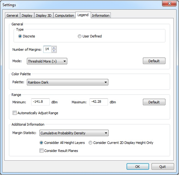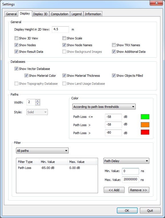 - According to Path Loss Thresholds: This option offers the possibility to define arbitrary thresholds and corresponding path colors for different path losses. The colors for the defined thresholds can be changed by clicking on the colored rectangles.