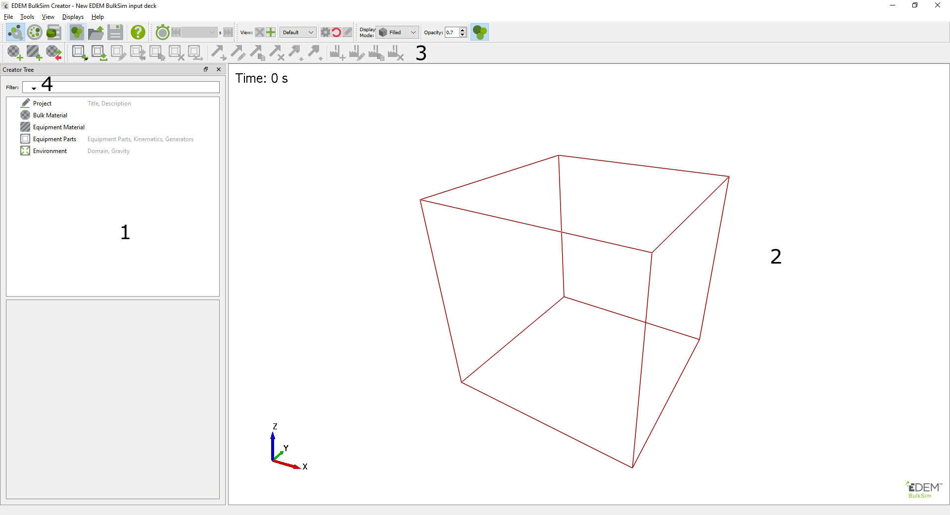 The EDEM Creator allows you to set up and initialize your model. It is where you import particles and geometries and define the other model parameters.