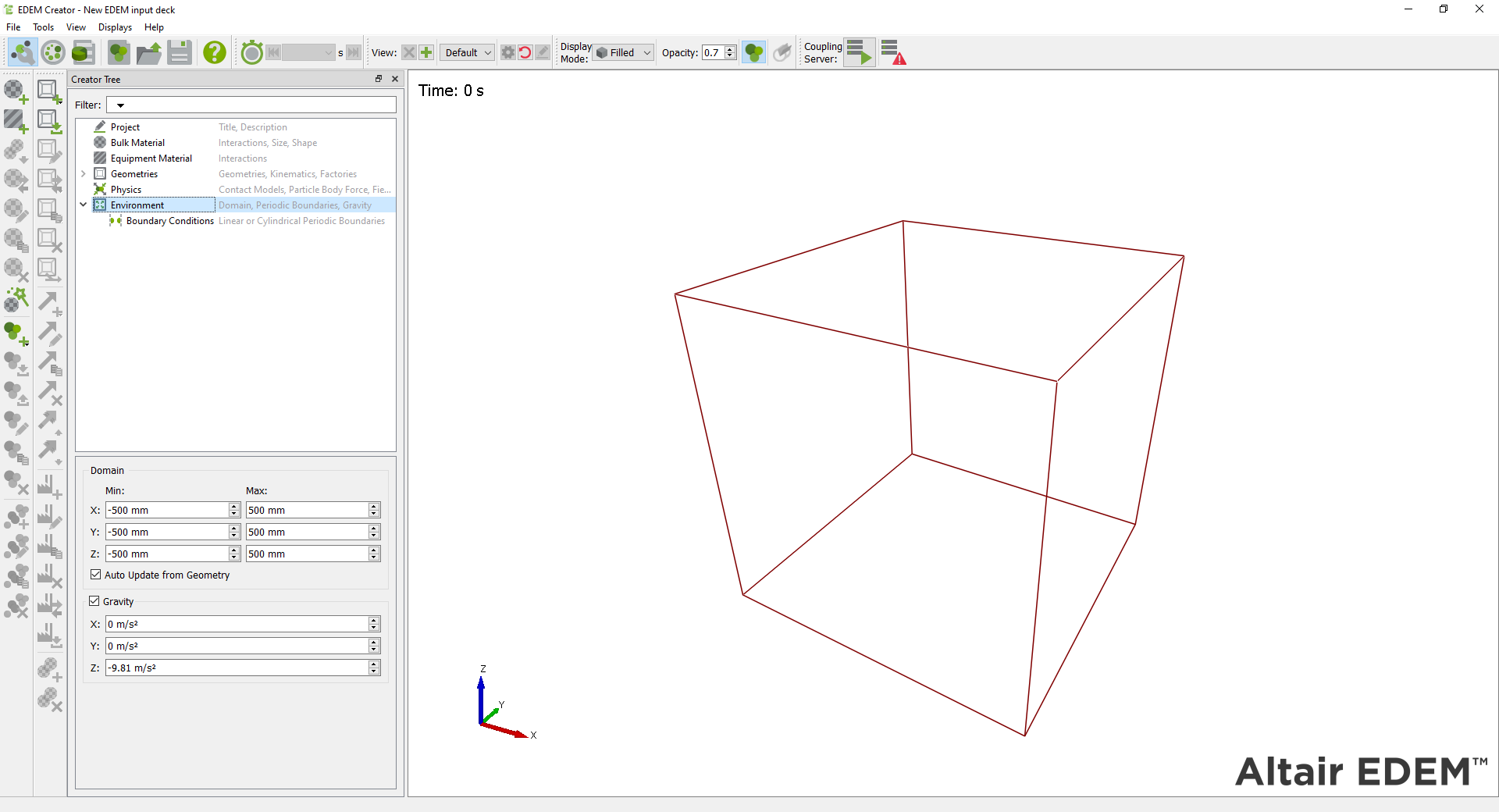 Enable the Gravity checkbox to set gravity in a given direction (X, Y, Z). The default settings are X: 0, Y: 0 and Z: -9.81 m/s2.