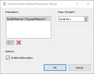 EDEM also allows you to deform geometry according to the quantitative results given by the Archard Wear model. To enable this feature, select Enable Deformation in the parameter values GUI as shown.