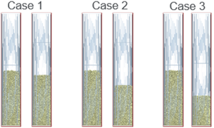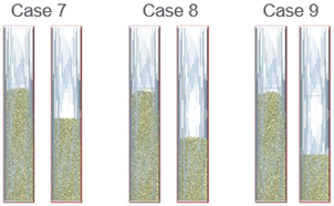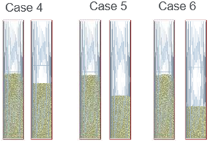 Research has shown that values of Carr Index below 15% indicate very good flow character but values above 25% indicate poor flow. Also, Hausner ratio values of around 1.00–1.25 indicate free-flowing powder, values between 1.26–1.45 indicate poor flow, and above 1.46 are related to extremely poor flow (Carr (1965), Wells (1988), Marshall (1986). The EDEM tapped density results indicate that the overall flow character of the materials is varied between excellent to fair however, the angle of repose measurements indicates that cases 4-6 have passable flowability and cases 7-9 have very poor flowability.