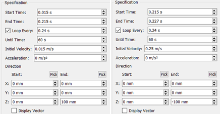 The settled material from the untapped density test was subjected to a repeating tap. A 3 mm drop was added to the cylinder repeating every 0.24 s (250 times per minute). This was introduced to EDEM via two repeating kinematics (show below). Every 60 s the motion was paused for 2 s to allow the material to settle and the bulk density measurement taken. When the bulk density variation between measurements was negligible the tapped density was recorded. A Time Step of 5e-6 s was used for the tap tests.