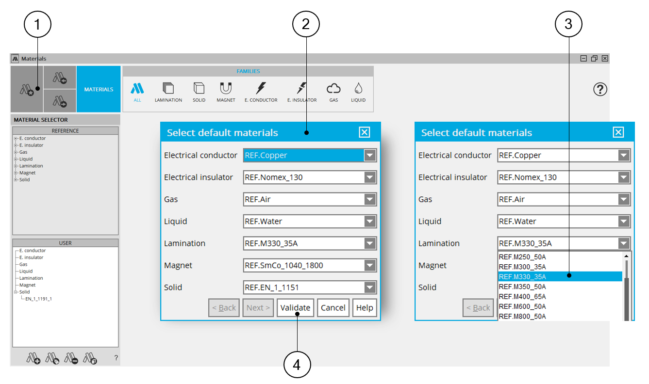 | 3 | For each material family, expanding the menu allows choosing among all the possible materials stored in the material database (reference as well as user material database. |
