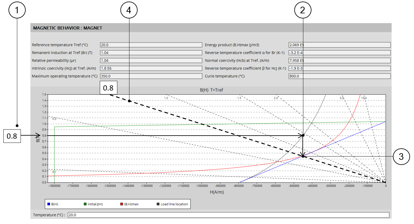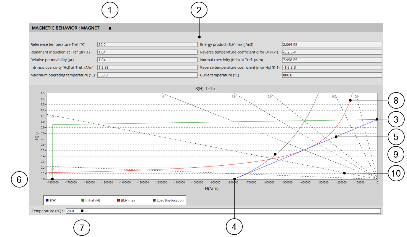 | 1 | Dialog box dedicated to the definition of magnet parameters. Located in the magnetic data tab when creating a new material or when editing the properties of an existing one. |
