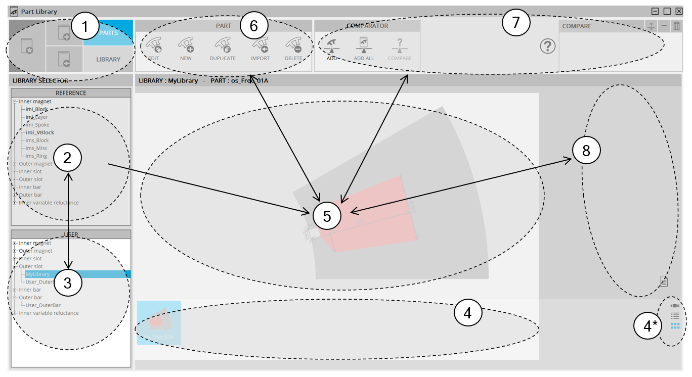 | Zone 6 | Tools to manage the parts: Edit, New, Duplicate, Import or Delete part. |