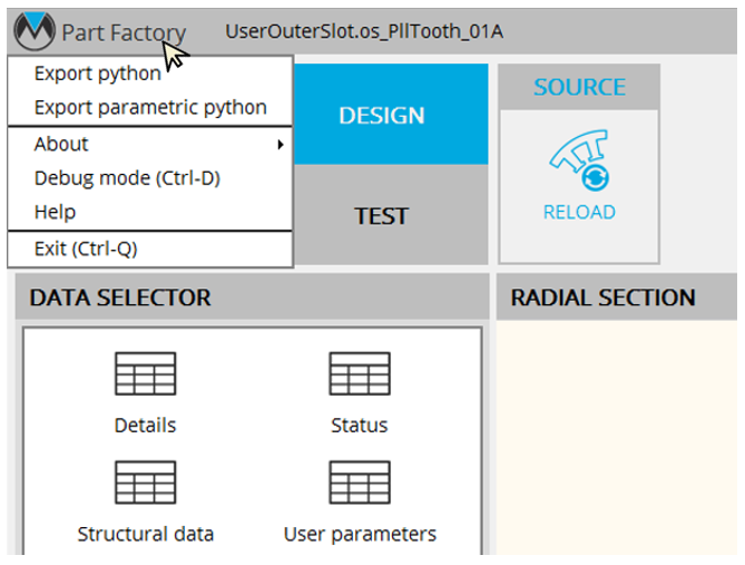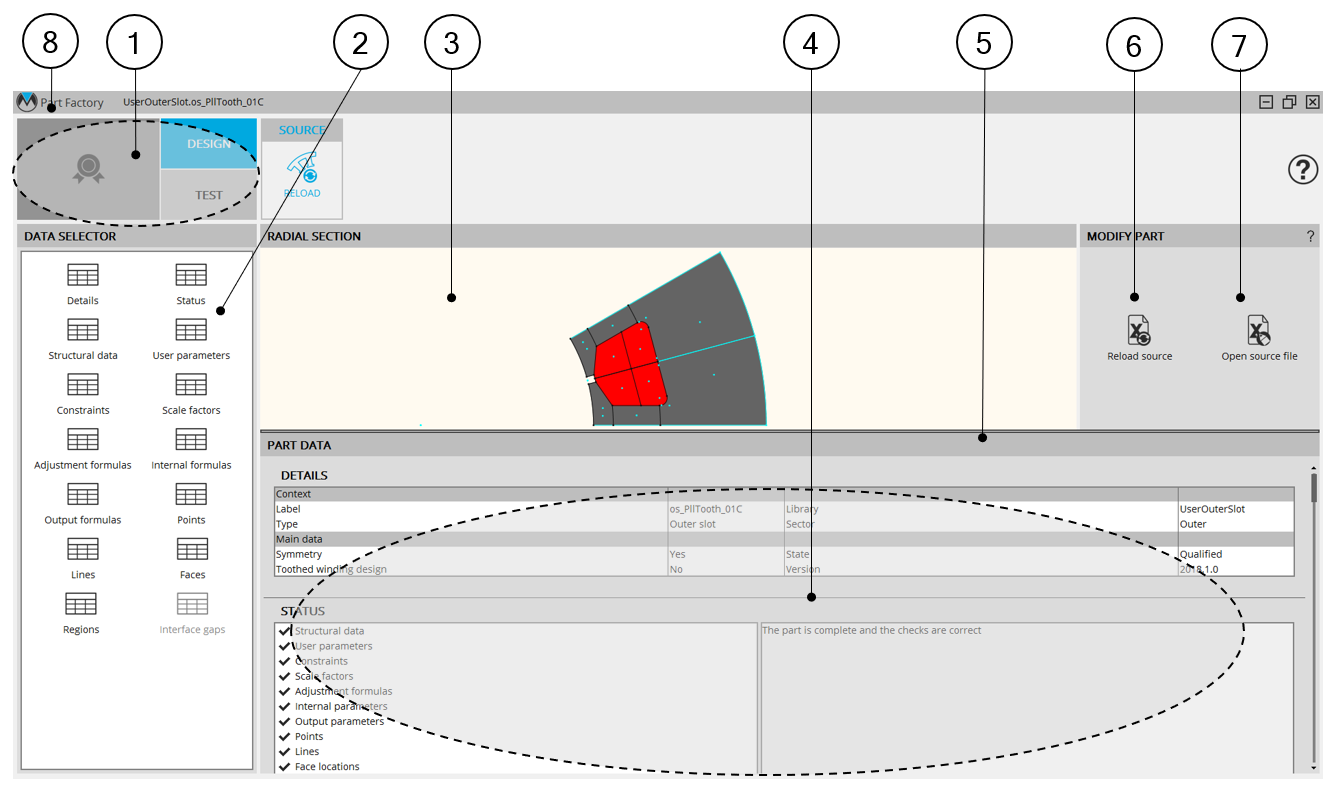 | 1 | Part Factory has two main environments: DESIGN and TEST. When DESIGN is selected, it appears in blue color and it shows the part properties. |