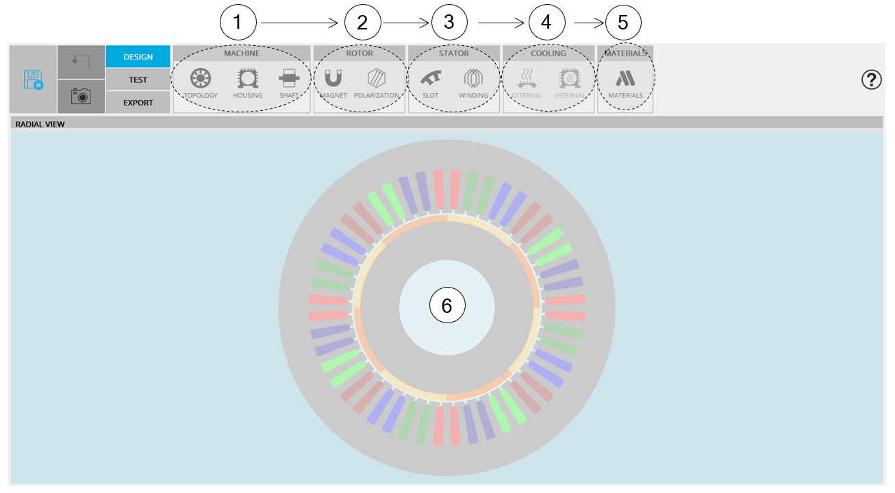 Visualization of the motor radial view. The winding (automatically defined) is shown. Note: Graphic functions like export picture and zoom