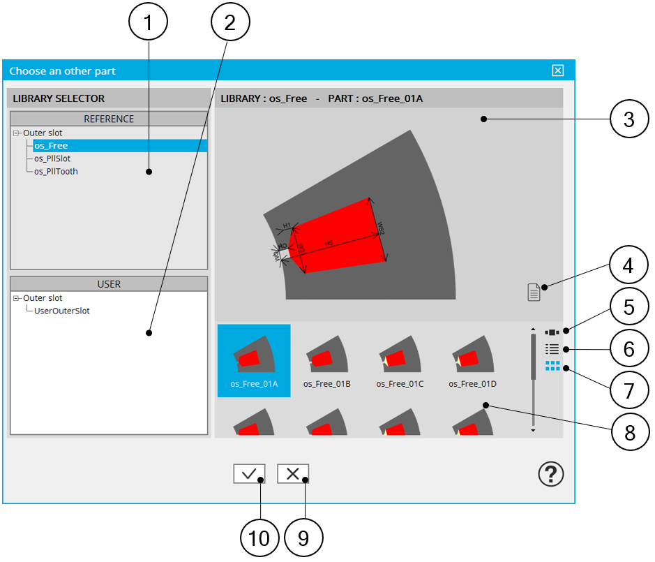 10 Button to choose and import the selected slot to modify the current stator design.