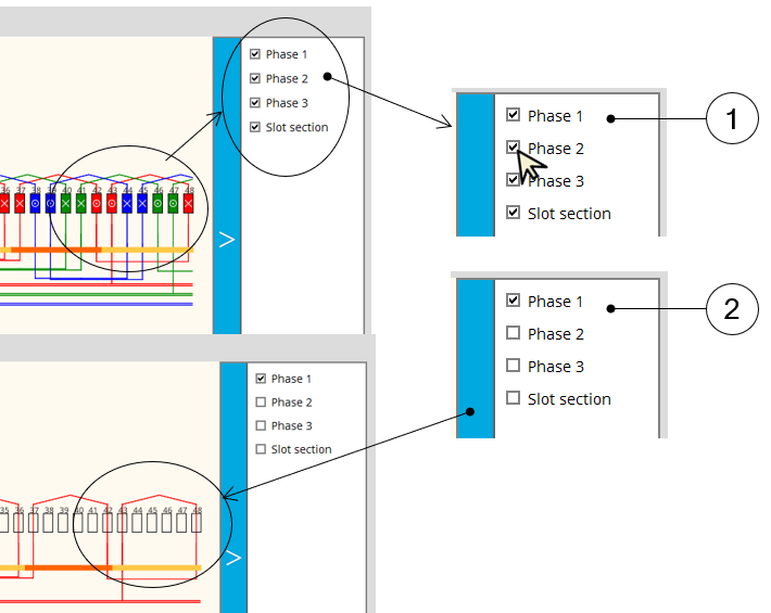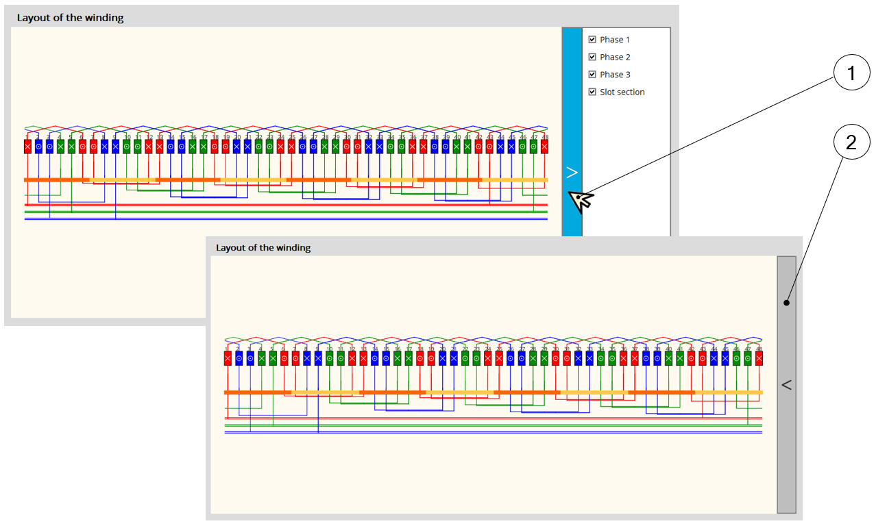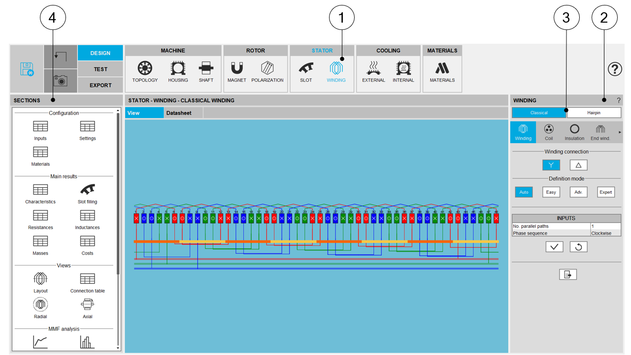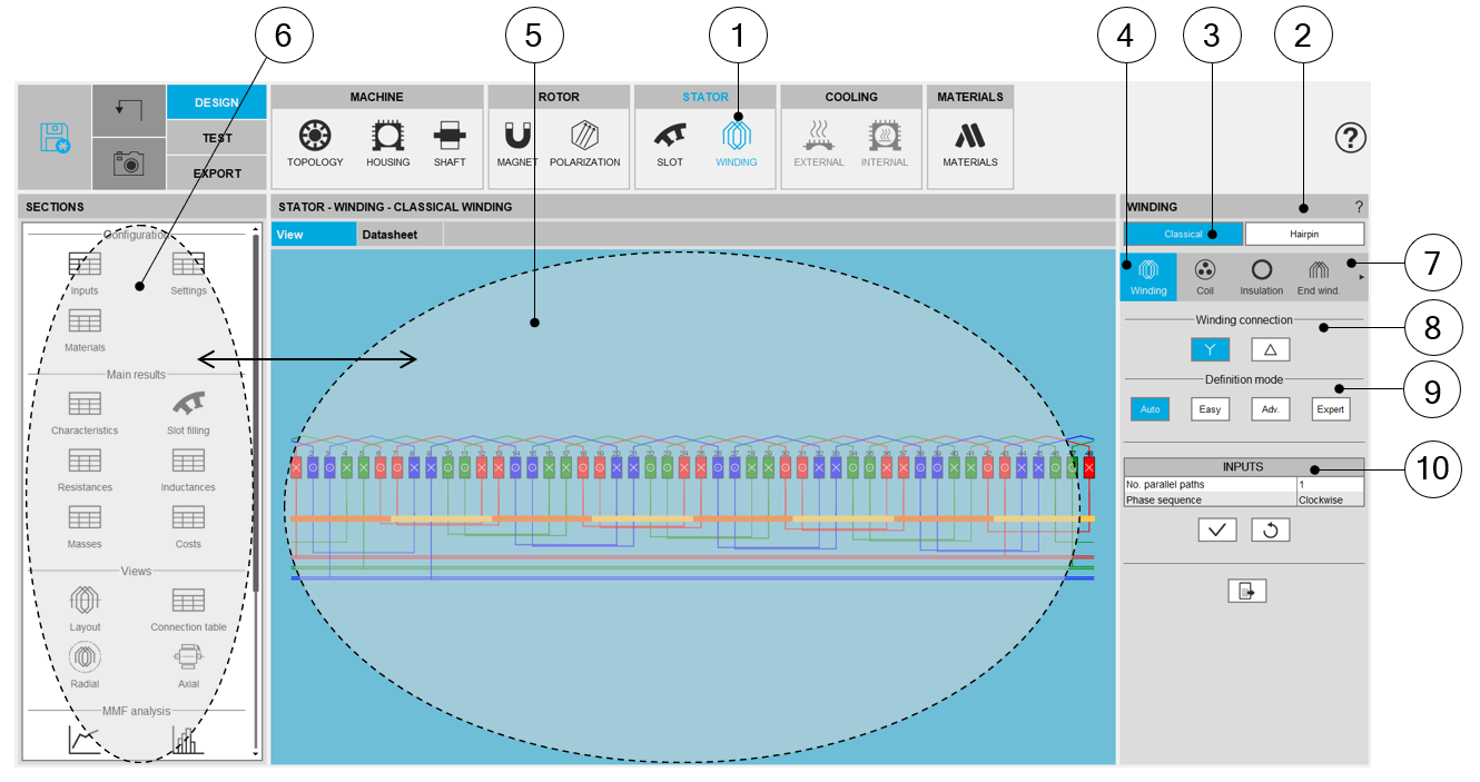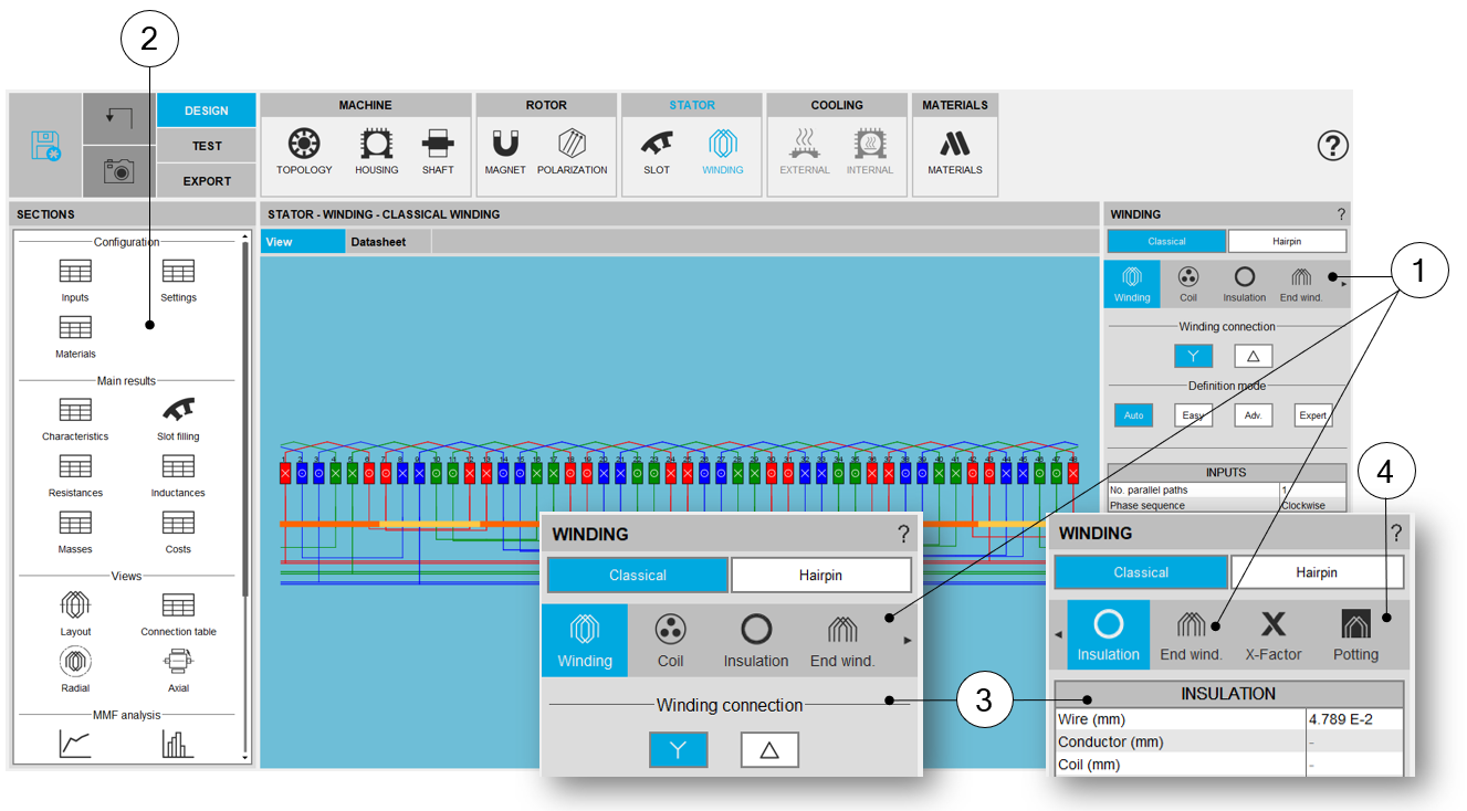 | 3 | Buttons to select the winding type “classical or hairpin” (here classical winding is selected – Highlighted in blue). |