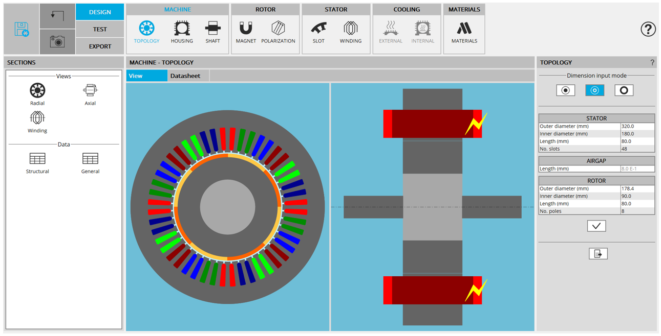 Structural data (outer and inner diameters, number of poles, number of slots, etc. must be defined from the sub area “Topology” when designing a new machine.